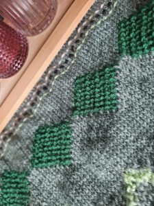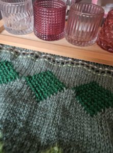 Merken jullie al dat ik de deadline nog niet “verschoven” heb. En ik nog steeds hoop dat ik hem optijd af krijg?! Het zorgt er in iedergeval voor dat ik door blijf breien en omdat week 8 niet zo heel moeilijk was ging ik er snel doorheen. Ik vind de donkergroene kleur mooi uitkomen. Ook merk ik dat ik de groene deken toch ook wel echt begin te waarderen. Het is bijna “jammer” dat ik hem weggeef. (Ondanks dat het groen niet echt in mn interieur past—