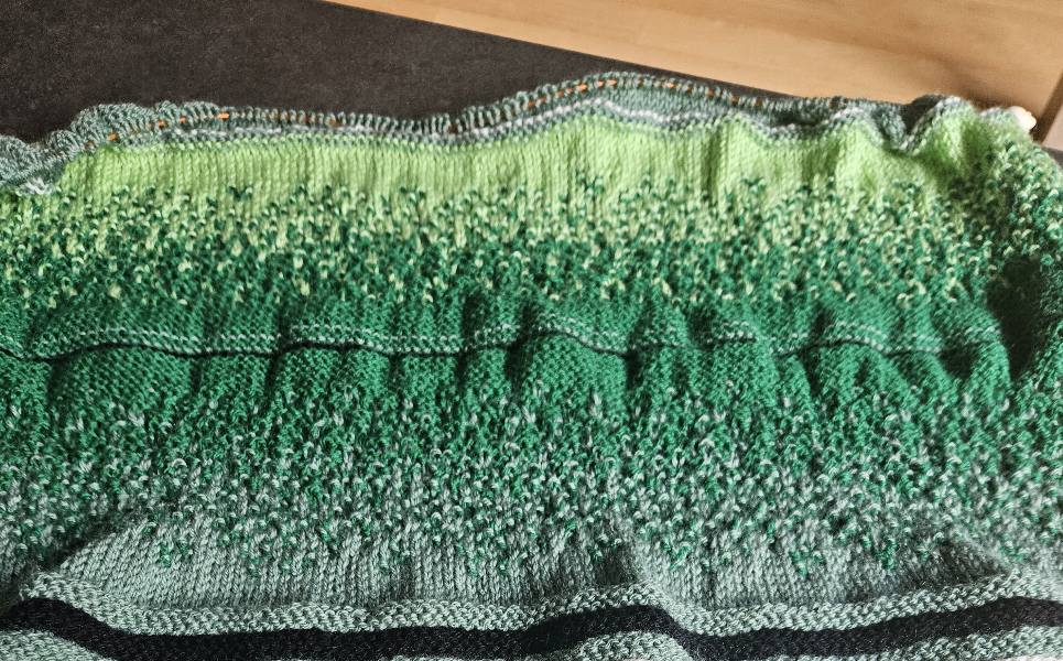 Merken jullie al dat ik de deadline nog niet “verschoven” heb. En ik nog steeds hoop dat ik hem optijd af krijg?! Het zorgt er in iedergeval voor dat ik door blijf breien en omdat week 8 niet zo heel moeilijk was ging ik er snel doorheen. Ik vind de donkergroene kleur mooi uitkomen. Ook