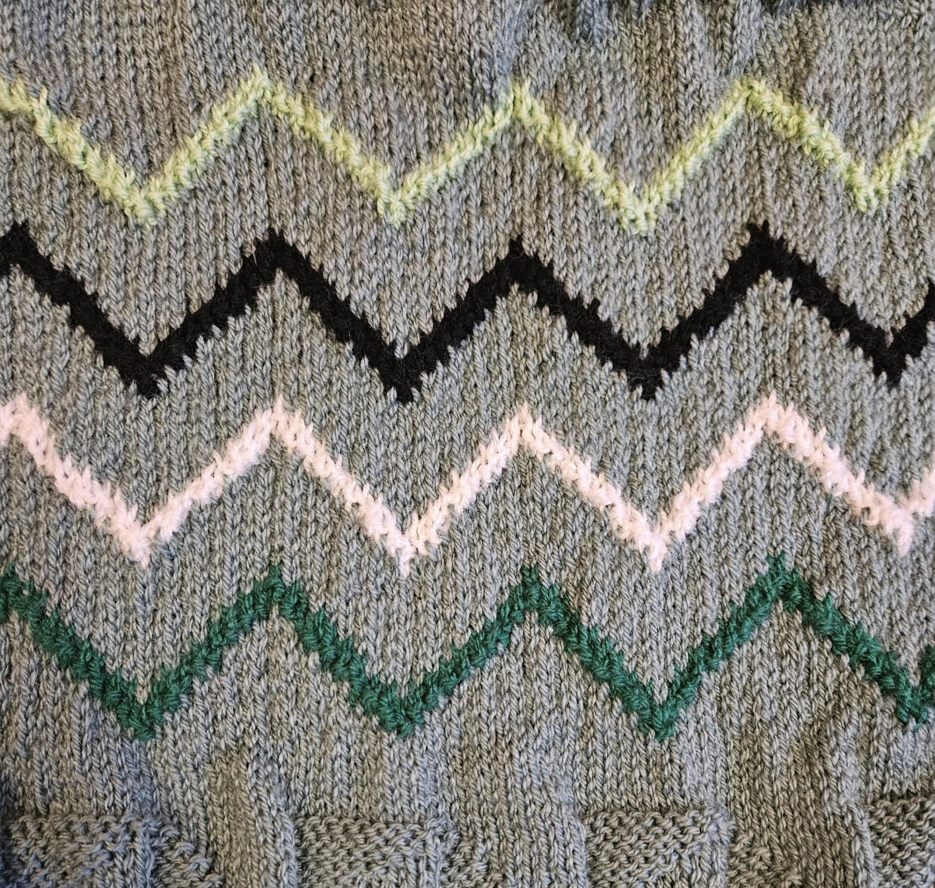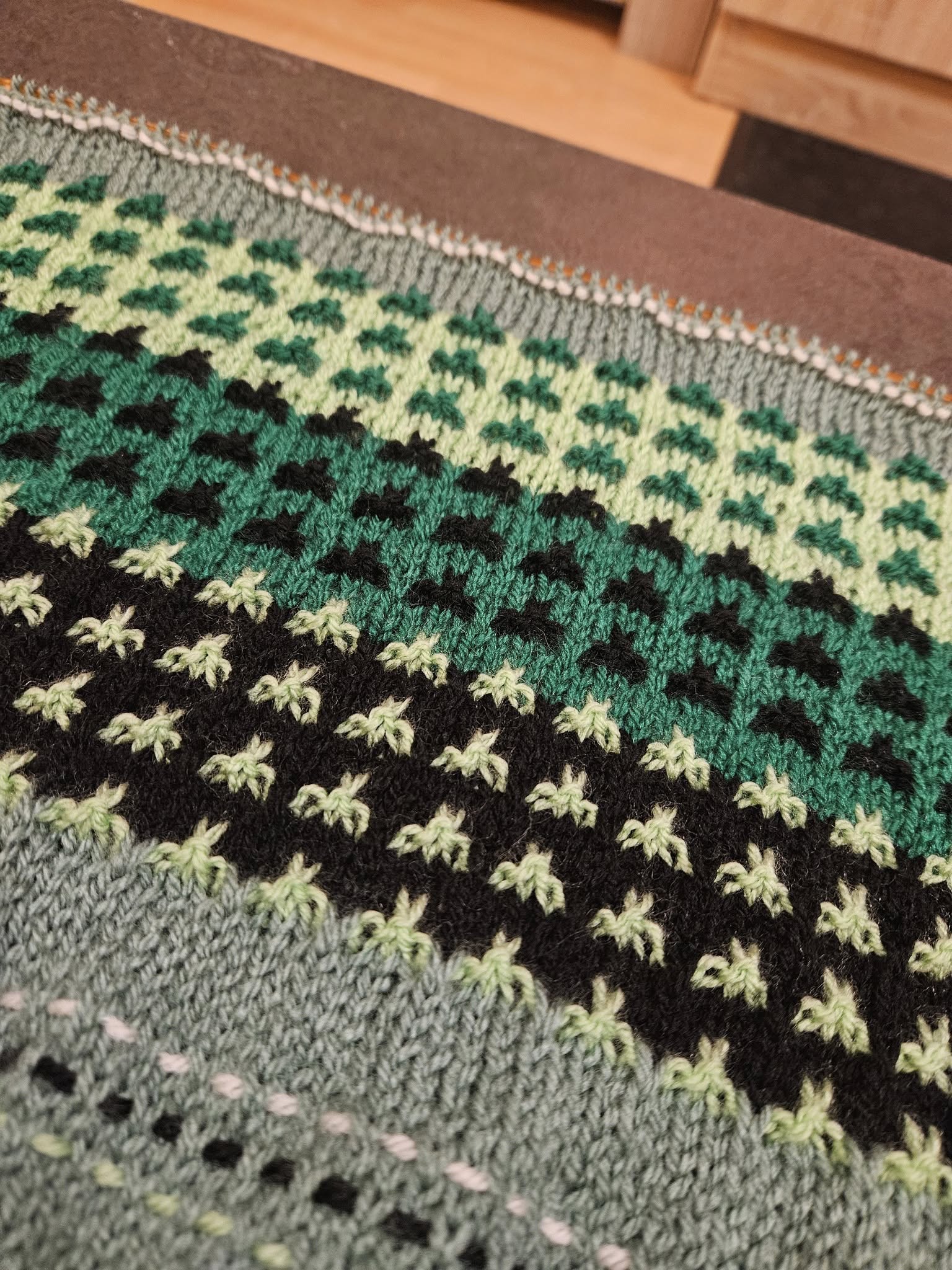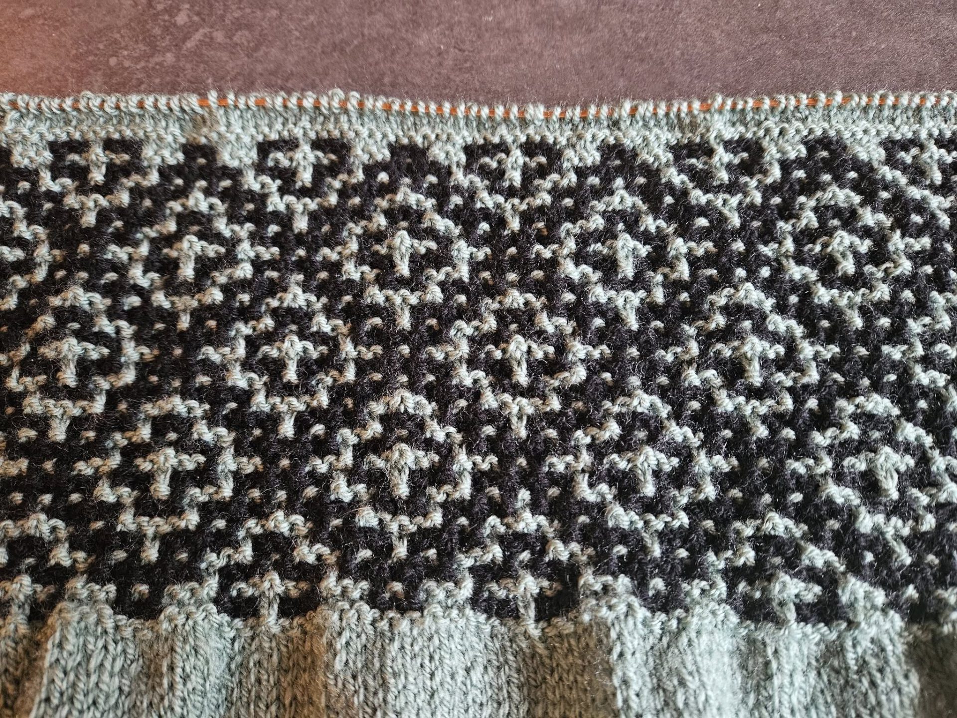 In het begin van week 9 wist ik niet zo goed of ik de kleurstelling van het patroon mooi vond uitkomen. Maar hoe verder ik kwam hoe toffer het werd. En inmiddels kan ik zeggen dat ik het opnieuw geweldig vind! Het breien ging vrij gemakkelijk en ergens heb ik nog steeds de hoop dat